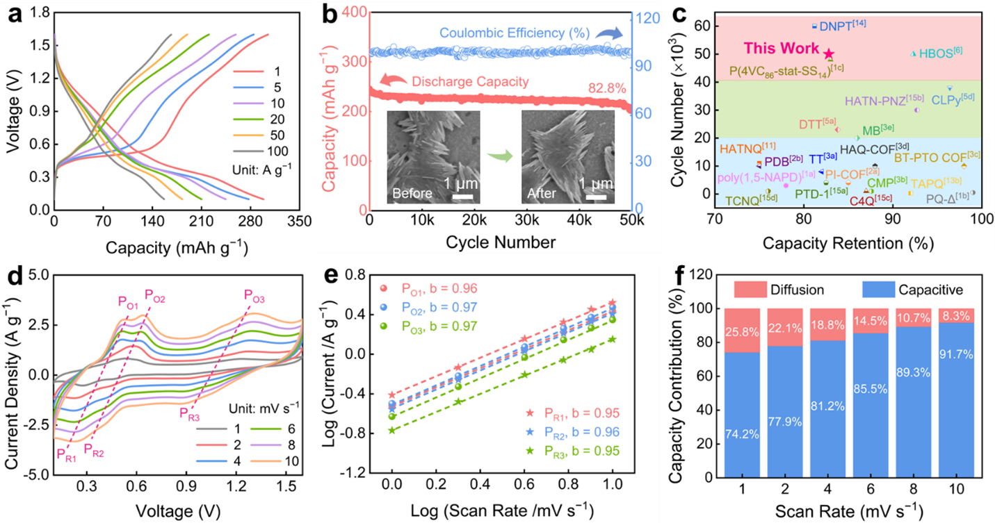 研究人员将有机超结构正极材料用于水系锌-有机电池,其表现出高比容量(299 mAh g−1@1 A g−1)、高倍率性能(157 mAh g−1@100 A g−1)和优异的循环稳定性(50,000次充放电后容量保持率为82.8%)。