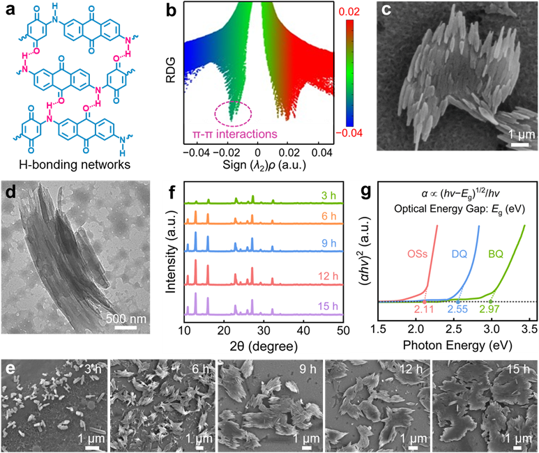 课题组研究显示,电子属性互补的对苯醌(电子受体)和2,6-二氨基蒽醌(电子给体)通过分子内氢键(N−H‧‧‧O)和π−π平面堆叠自组装形成片状有机超结构,其展示出很强的亲电子活性和较低的能带间隙,有助于加快电子转移动力学和电极氧化还原速率。