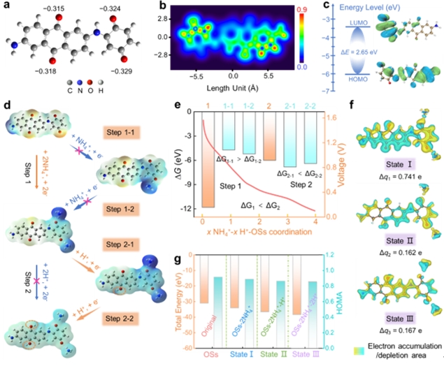 研究人员通过异位光谱研究,表明高度稳定的有机超结构能有效抑制活性官能团溶解,充分暴露羰基电活性中心,引发高度可逆的氧化还原反应;同时有机超结构克服了Zn2+去溶剂化能垒过高引起的动力学迟滞问题,促进了超稳定和快速的两步四电子NH4+/H+电荷载体共存储。