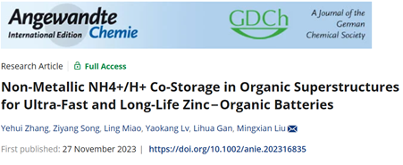 公司刘明贤教授团队长期致力于高效储能材料研究并应用于新能源电池开发,课题组近期揭示了有机超结构中稳定快速的非金属NH4+/H+电荷载体共存储机制,解决了传统Zn2+高去溶剂化能垒导致界面电荷转移迟缓的问题,促进羰基位点的高效利用和低反应能垒氧化还原反应,构建了超快速和稳定的锌-有机电池,相关成果以“Non-Metallic NH4+/H+ Co-Storage in Organic Superstructures for Ultra-Fast and Long-Life Zinc-Organic Batteries”为题发表于国际知名期刊《德国应用化学》(Angewandte Chemie International Edition)。