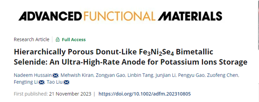 公司刘韬教授团队长期致力于新型锂电池的设计开发,近期首次通过一步无模板策略成功制备了分层多孔环状Fe3Ni2Se4(NFS),并研究了其作为磷酸钾电池新型负极材料的电化学性能。该策略消除了模板合成的复杂过程,切断了传统的中空结构合成,并巧妙地利用了Kirkendall效应,通过金属离子和非金属离子的非对称扩散构建了环状形态。分层多孔的环状结构提供了高比表面积和缩短的离子扩散路径,以加速氧化还原动力学,提高了速率性能和循环稳定性。因此,得到的NFS在可逆容量、倍率性和长循环方面均展现出优异的电化学性能。相关成果以“Hierarchically Porous Donut-Like Fe3Ni2Se4 Bimetallic Selenide: An Ultra-High-Rate Anode for Potassium Ions Storage”为题发表在国际权威期刊Advanced Functional Materials上。