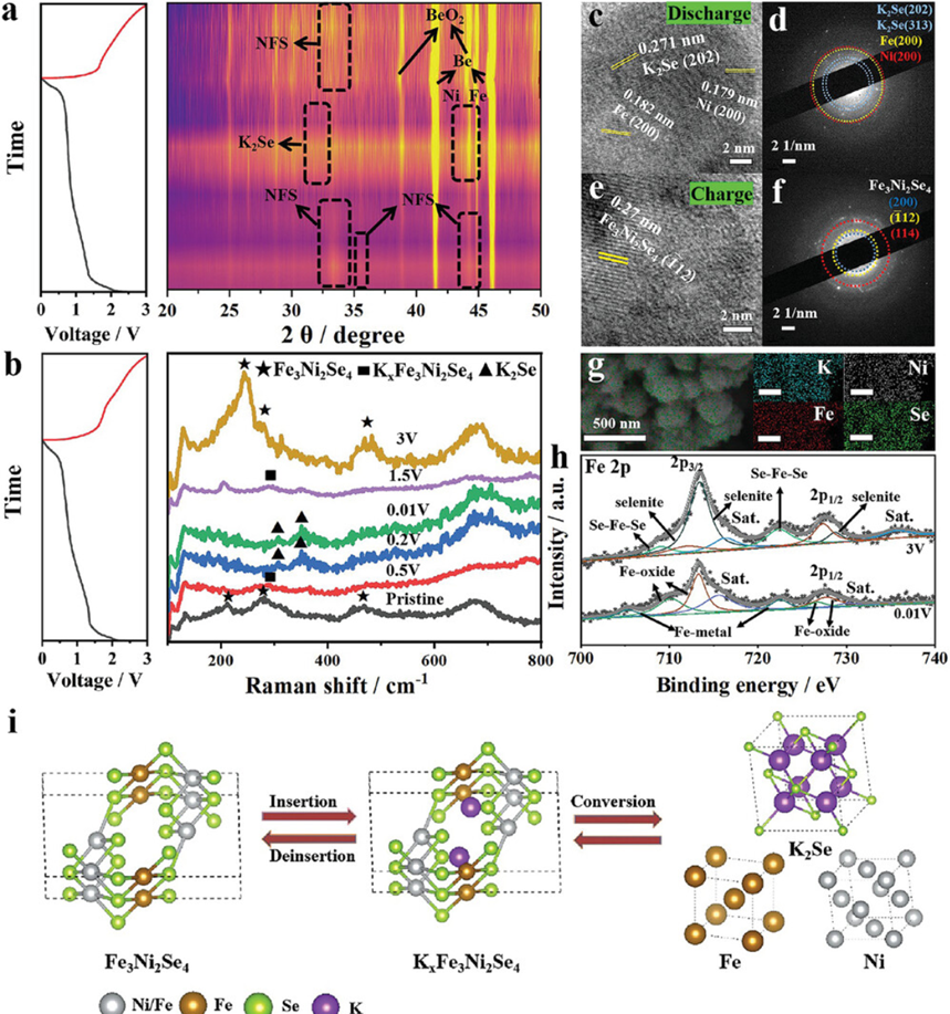 图4. 首次放电/充电循环过程中a)原位XRD图谱及b)非原位拉曼光谱。完全放电状态(c、d、g)和完全充电状态(e、f)下的非原位高分辨TEM图像、SAED和元素分布。h) 完全放电和完全充电状态下的Fe 2p XPS谱。i) Fe3Ni2Se4转化机制的示意图