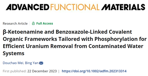 公司闫冰教授团队长期致力于共价有机框架材料(COFs)的功能化及应用研究,先后在Anal. Chem.、Small、Chem. Eng. J.、ACS Sustainable Chem Sci. Eng.、ACS Appl. Mater. Interface、J. Hazardous Mater.、Sens. Actuators B-Chem.、J. Mater. B/C、Talanta等主流期刊上发表论文20余篇,并受邀撰写该领域评述工作于Chemistry -A European Journal上在线正式发表(B. Yan*, Chem. Eur. J. 2023, 29(45), e202301108.)。近期该团队成功地合成β-酮烯胺和苯并恶唑连接的共价有机框架材料,并进行磷酸功能化改性,将之应用于从污染的水环境中去除铀U(VI),相关成果以《β-Ketoenamine and Benzoxazole-Linked Covalent Organic Frameworks Tailored with Phosphorylation for Efficient Uranium Removal from Contaminated Water Systems》为题发表于国际知名期刊Advanced Functional Materials上。