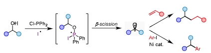 研究人员以醇作为反应前体,利用廉价易得的二苯基氯膦作为原位活化试剂,以碘作为外源自由基来源,得到的膦自由基中间体β-断裂产生烷基自由基,一步完成了对醇的原位脱氧活化,高效经济的实现了C(sp3)- C(sp3)和C(sp3)- C(sp2)的构筑。