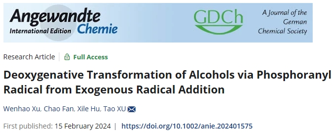 利用RO-C碳中心自由基β-断裂产生烷基自由基实现醇的脱氧偶联已有报道,但形成这种中间体需要昂贵的活化试剂,而通过RO-P膦中心自由基β-断裂产生烷基自由基有望提供一种高效活化醇脱氧偶联的方式。日前,公司徐涛教授课题组发展了一种基于外源自由基加成得到磷自由基中间体实现醇的直接脱氧转化的新方法,相关研究成果“Deoxygenative Transformation of Alcohols via Phosphoranyl Radical from Exogenous Radical Addition”在线发表于化学领域著名国际学术期刊《德国应用化学》(Angewandte Chemie International Edition, 2024,e202401575)。