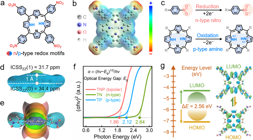 课题组研究显示,四硝基卟啉展示出高度共轭结构、强电化学活性、高芳香性和较低能带间隙,有助于加快电子转移动力学和电极氧化还原速率。