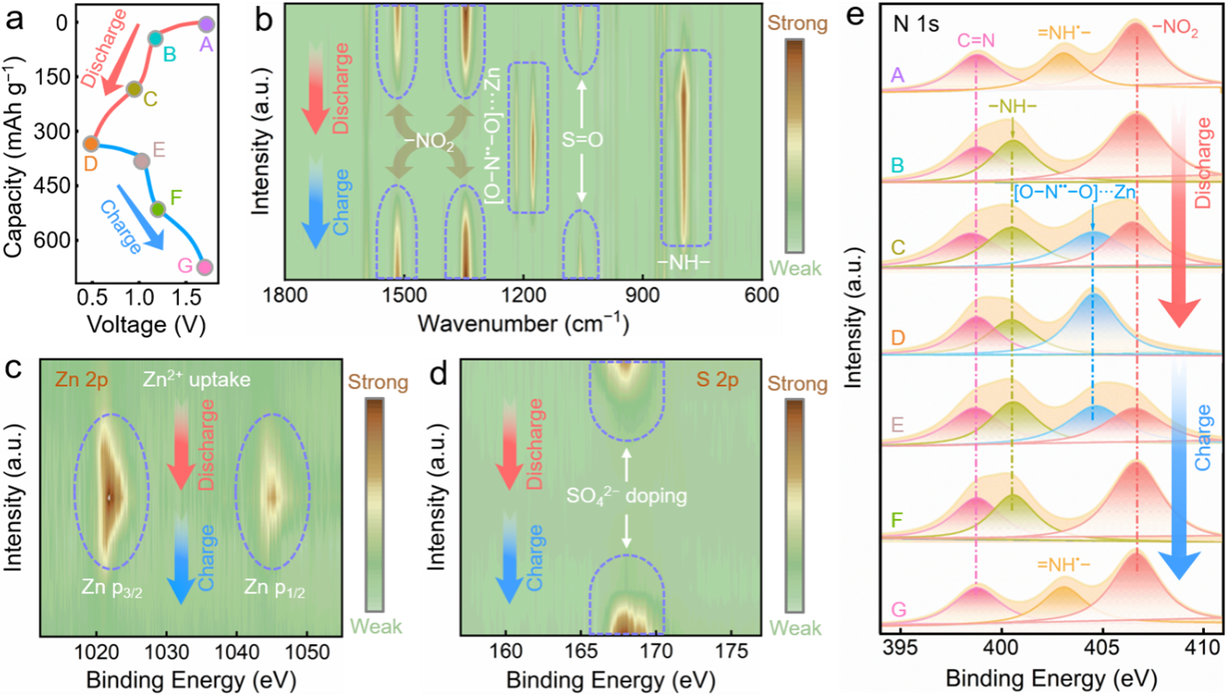 研究人员通过异位光谱研究,表明硝基/仲胺作为四硝基卟啉的n型和p型电活性中心,分别与Zn2+和SO42−电荷载体反应,引起发高度可逆的连续阴/阳离子共配位反应。