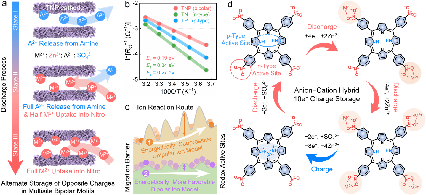活化能计算表明,四硝基卟啉实现了低反应能垒的Zn2+/SO42−相反电荷交替配位过程,有效消除了相同离子间库伦斥力影响,促进了稳定和快速的三步10e−氧化还原电荷存储过程。