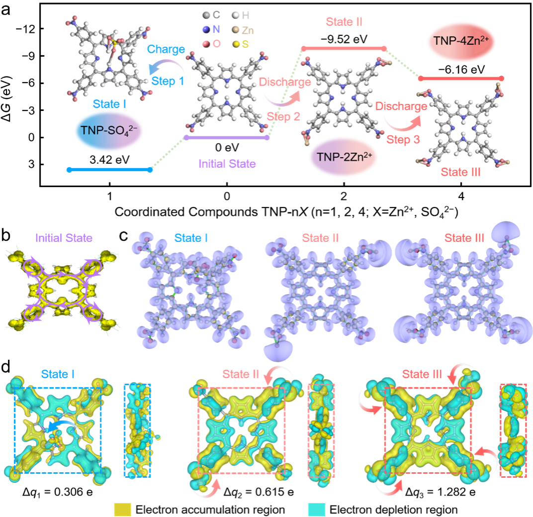理论计算表明,四硝基卟啉硝基/仲胺位点与Zn2+/SO42−间存在强相互作用,稳定的三步10e−阴/阳离子共配位促进电极/电解质界面电荷累积,显著提高了电荷存储容量。