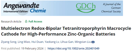 公司刘明贤教授团队长期致力于高效储能材料研究并应用于新能源电池。日前,该课题组设计了多电子双极型四硝基卟啉大环有机正极材料,促进了低反应能垒的Zn2+/SO42−相反离子交替配位,揭示了n型硝基和p型仲胺协同氧化还原电荷存储机制,有效解决了当前双极型有机材料存在的问题,构建了高能量密度和长循环寿命的锌-有机电池,相关成果以“Multielectron Redox-Bipolar Tetranitroporphyrin Macrocycle Cathode for High-Performance Zinc-Organic Batteries”为题发表于国际知名期刊《德国应用化学》(Angewandte Chemie International Edition)。