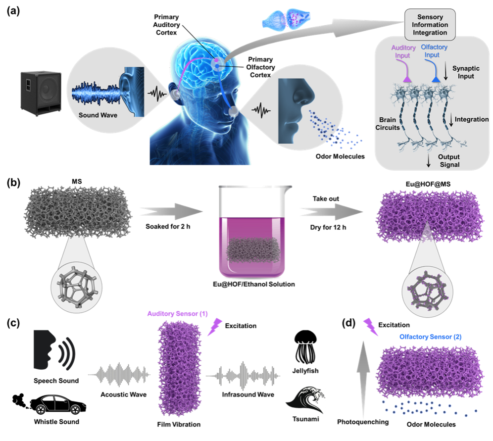 (a) 声音和气味分子刺激的生物多感官整合神经系统;(b) Eu@HOF-BPTC@MS的制备;(c) 听觉传感器的声波和次声波传感;(d) 嗅觉传感器的气味分子传感