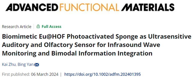 日前,公司闫冰教授团队巧妙地将仿生学思想融合于氢键有机框架光激活器件设计之中,制备出超灵敏的听觉-嗅觉光响应柔性仿生传感器,并能同时应用于物理刺激次声波与化学刺激挥发性气体的监测和双峰信息集成,相关研究成果以“Biomimetic Eu@HOF photoactivated sponge as ultrasensitive auditory and olfactory sensor for infrasound wave monitoring and bimodal information integration”为题在线发表于国际知名期刊《先进功能材料》(Advanced Functional Materials, 2024, 34, 2401395.)。