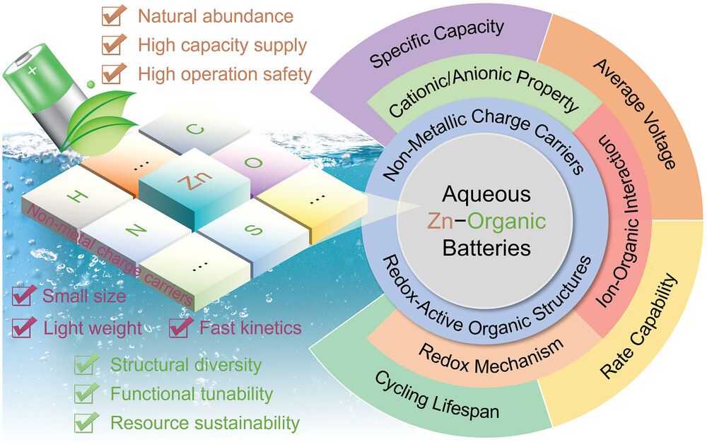 锌-有机电池因其资源可持续性、高安全性和低成本等优点,是近年来备受关注、极具竞争力的电化学储能器件。电荷载体是影响锌-有机电池氧化还原动力学和电化学性能的关键因素之一。由于较大水合离子尺寸和高去溶剂化能垒,金属Zn2+电荷载体面临界面反应动力学迟缓问题,其循环充放电过程中反复嵌插也容易破坏电极结构。H+、NH4+等电荷载体因离子半径小、质量轻,具有低去溶剂化能垒和快速离子迁移动力学,对锌-有机电池性能提升起着关键作用。