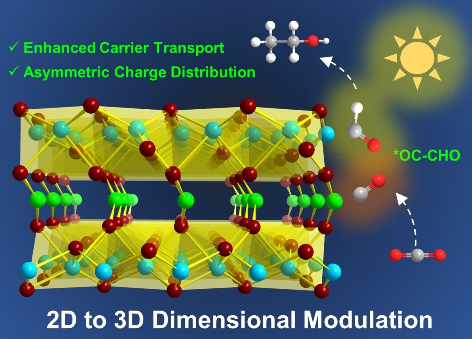 研究人员采用亚氨基二乙酸盐(ida)代替戊二酸盐(glu)作为有机连接剂,通过单原子变化(CH2 vs. NH)来调节碘化铅亚晶格的维度(2D→3D)。进而通过合理的晶体工程设计产生了首个具有阳离子3D碘化铅成分的CP实例—[Pb3I4](ida),与准2D碘化铅CP(Pb2I2(glu))相比,[Pb3I4](ida)具有更低的激子结合能和更高的载流子迁移率。此外,2D→3D 尺寸调节引入了相邻[Pb2I2]2+层间多金属位点的局部结构不对称性,显著降低了光催化CO2还原过程中C-C耦合步骤的能量势垒。具有3D [Pb3I4]2+亚晶格的碘化铅CP实现了整体光催化CO2还原和H2O氧化,生成的C2H5OH具有高选择性和高生成率。光物理研究结合理论计算表明,3D结构中桥接的[PbI2]团簇不仅能增强载流子传输,还能促进固有电荷极化,从而促进C-C耦合,相关结果证明这是迄今为止C2产物的最佳光催化剂之一。该研究为合理设计用于CO2光还原的有机卤化铅结构提供了一种新的配位化学策略。