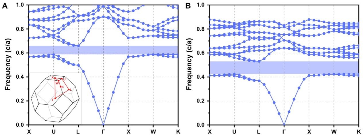 焙烧样品的透射电镜照片(图3A-3D)显示了其高度有序的结构,电子晶体学三维重构所得静电势密度分布(图3F-3H)证明了SD结构的四连接构型,并通过透射电镜照片模拟得以验证。选区电子衍射和高分辨率透射电镜图像(图3E)说明SD骨架由多晶锐钛矿晶体堆叠形成。计算结果显示该结构具有完全光子带隙,对于锐钛矿TiO2结构(ε = 6.25),其带隙宽度为11.54%(图4A),随着介电对比度的增加(ε = 13),带隙宽度也随之增加(图4B)。