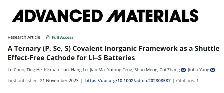 该研究团队近期还首次提出一种三元(P, Se, S)共价无机骨架材料作为锂硫电池无穿梭效应的正极材料,相关研究成果“A Ternary (P, Se, S) Covalent Inorganic Framework as a Shuttle Effect-Free Cathode for Li-S Batteries”发表于国际知名期刊《先进材料》(Advanced Materials)。