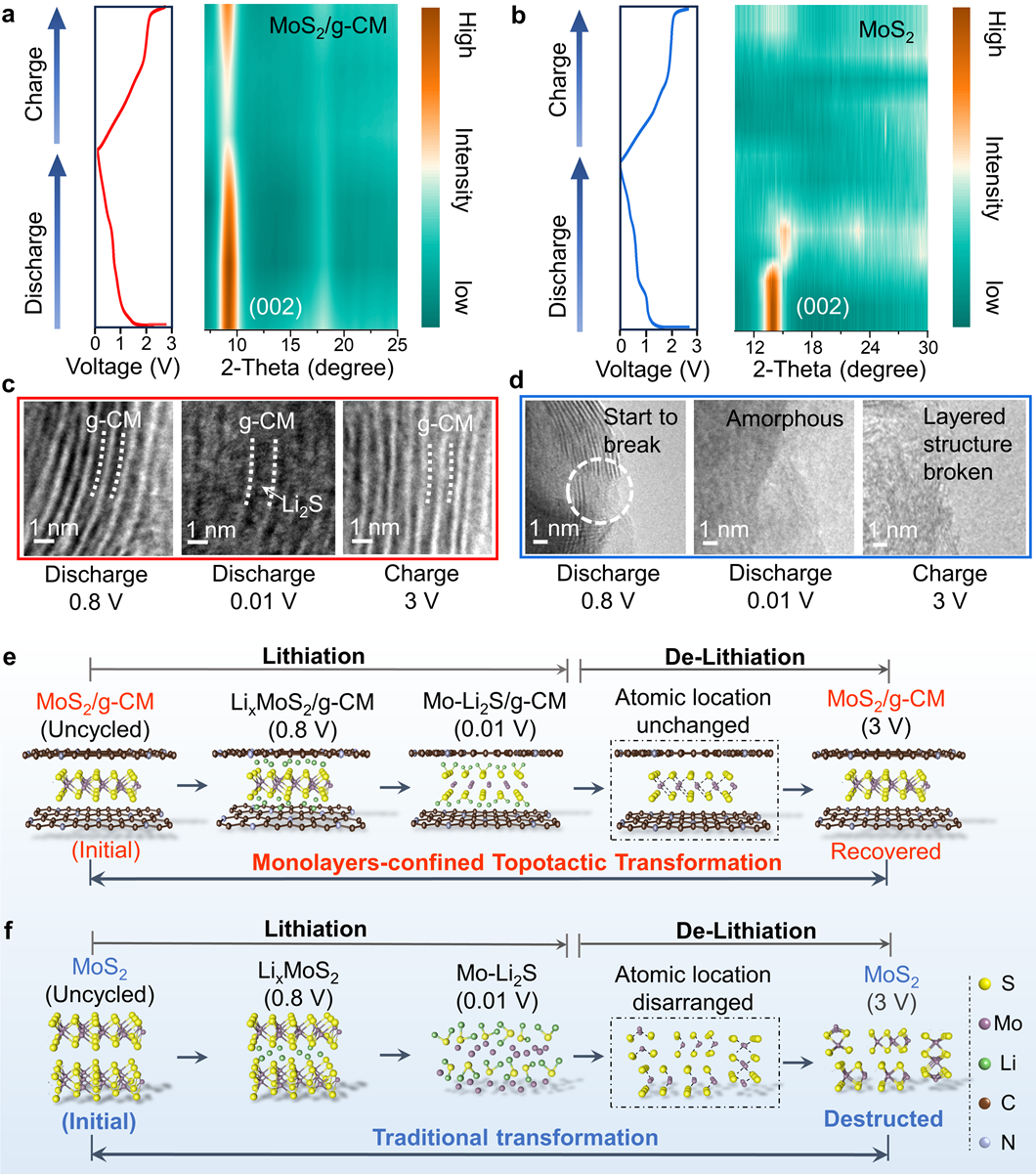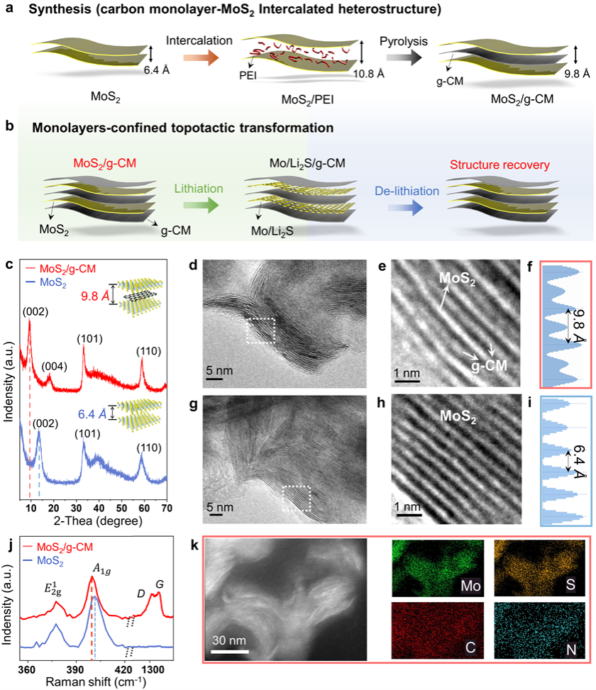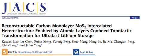 二维材料的插层结构设计可以扩大材料的层间距,促进离子在层间的传输,对发展快速充电锂离子电池具有重要意义。然而,目前插层策略一般采用金属离子或者小分子作为插层剂,这些插层剂很容易在电池循环过程中流出,造成插层设计失效。此外,二维材料作为锂离子电池负极材料在经历深度锂化反应后层状结构会被严重破坏,从而导致电池性能下降。迄今为止,尚未有层状电极材料在充放电循环中承受剧烈相变和体积变化后仍能保持插层结构的报道。针对这一问题,杨金虎教授与张弛教授团队近日设计了一种单层碳插层在二硫化钼范德华层间的异质结构材料,作为负极材料在锂离子电池储能过程中具有独特的“原子层限域拓扑反应”和可逆重构的特性,并展现出了超快充性能,相关研究成果“Reconstructable Carbon Monolayer-MoS2 Intercalated Heterostructure Enabled by Atomic Layers-Confined Topotactic Transformation for Ultrafast Lithium Storage”发表于国际化学领域的权威学术期刊《美国化学会志》(Journal of the American Chemical Society)。