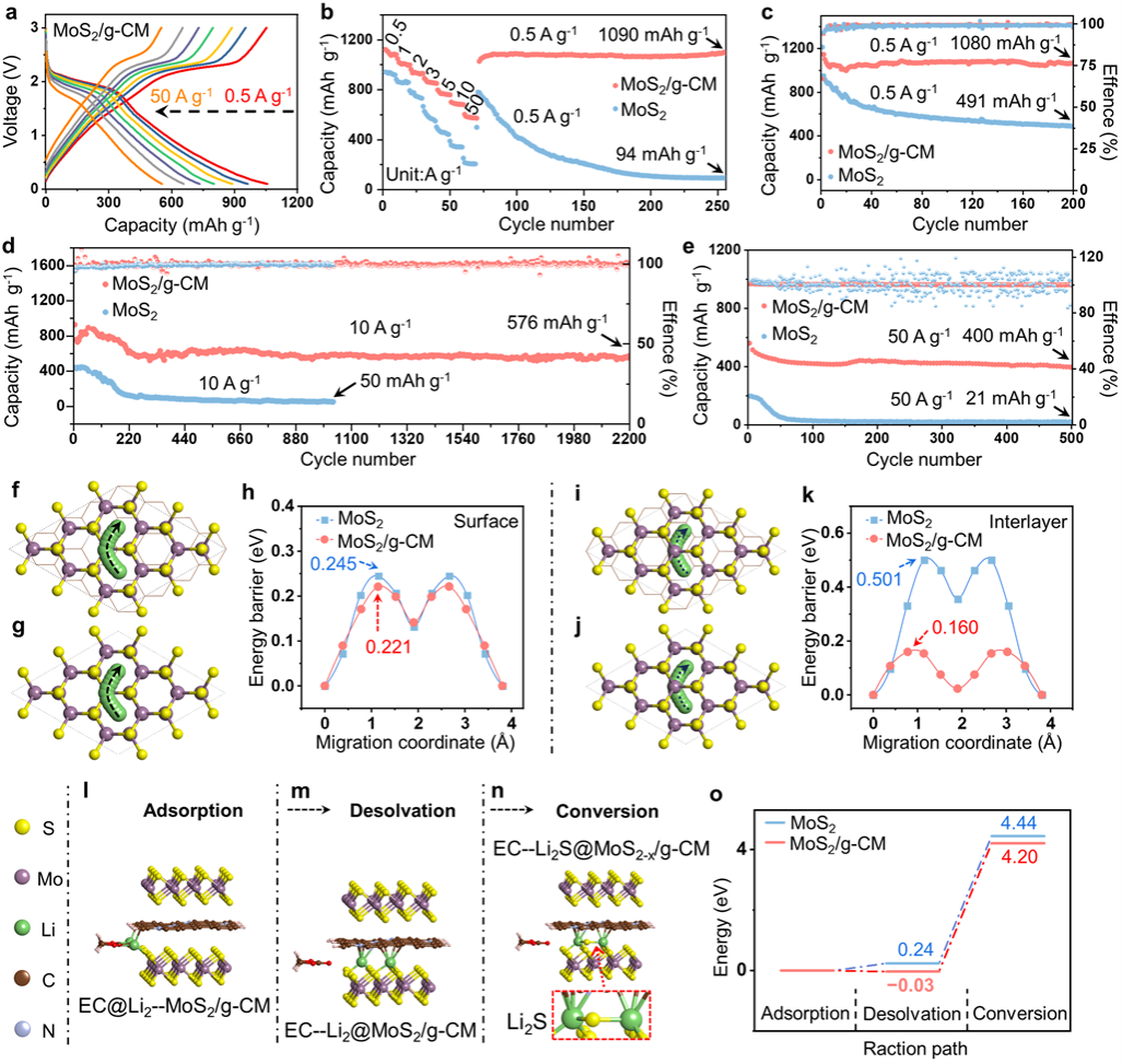 MoS2/g-CM作为锂离子负极材料展现出优异的循环性能和高达50A g-1的倍率性能。通过DFT理论计算证明,锂离子在插层结构的层间具有较低的迁移势垒和较低的锂化自由能变化,这是赋予电池超快充性能的原因。