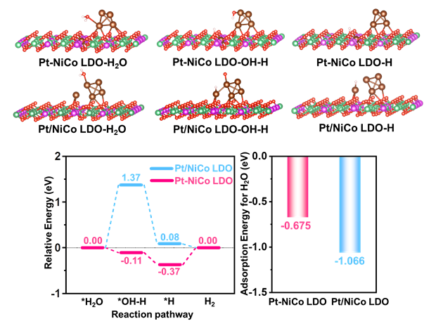 研究团队利用双离子刻蚀结合原位相变技术,实现了将Pt SAs和Pt团簇精确定位于NiCo LDO层内及表面(Pt-NiCo LDO),Pt SAs插入到LDO层中通过占据部分Ni原子的位置形成Co-Pt键,促进了Pt与NiCo LDO之间有效的电子相互作用。这些层内Pt SAs与表面Pt团簇协同作用下,HER过程中H2O优先吸附于Pt团簇,其中H*吸附在层内Pt SAs上方的O位点上,显著加速了碱性介质HER过程中H2O的解离,由此获得了比20 wt%的商用Pt/C高近6倍的优异碱性HER性能。