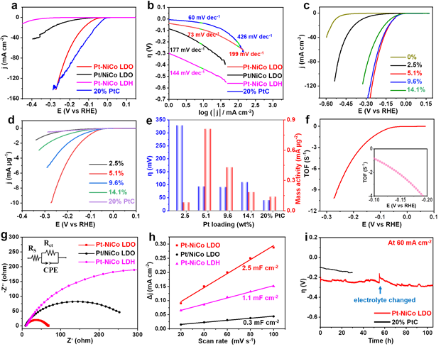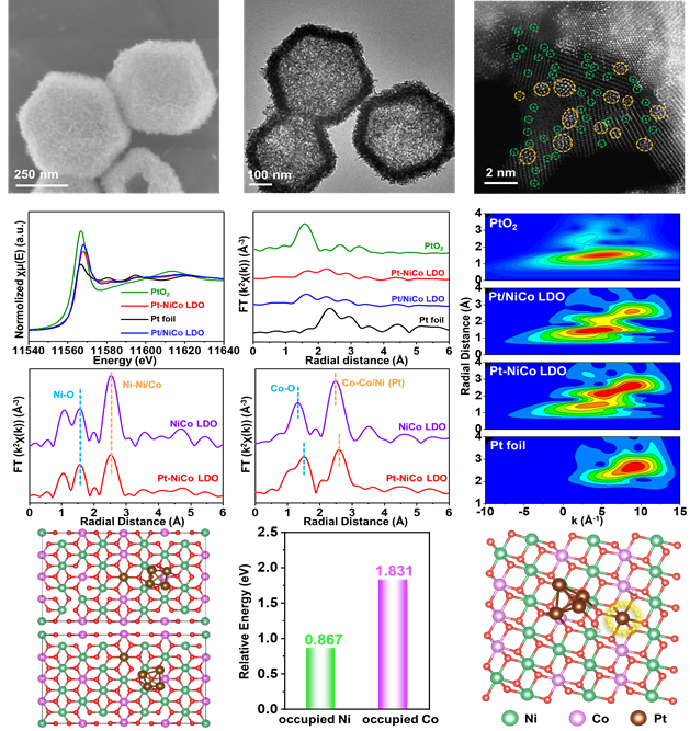 研究人员通过双离子刻蚀结合原位相变技术得到了具有十二面体空心结构和层状纳米片形貌的Pt-NiCo LDO材料。通过球差校正电子显微镜观看到Pt SA(绿色圆圈标记的亮点)和Pt团簇(橙色圆圈),且单原子的总量大于团簇,表明Pt是由单原子和团簇共存的形式存在。X射线吸收谱检测到明显的~1.50 Å Pt-O峰和~2.40 Å Pt-Pt峰,进一步证明了Pt SA和Pt团簇共存于Pt-NiCo LDO材料中。小波变换分析结果显示,在Pt-NiCo LDO中检测到5和7.5 Å-1附近的峰值,对应于Pt-Cl和Pt-M(M=Ni/Co)。因此,Pt原子被插入到LDO层中并与Ni或Co结合,而不是简单地位于层的表面。结合位点吸附的理论计算证实,Pt-NiCo LDO中Pt SA插入NiCo LDO层中是通过占据部分Ni位置形成Pt-Co键,保证了Pt与NiCo LDO之间的强电子相互作用。