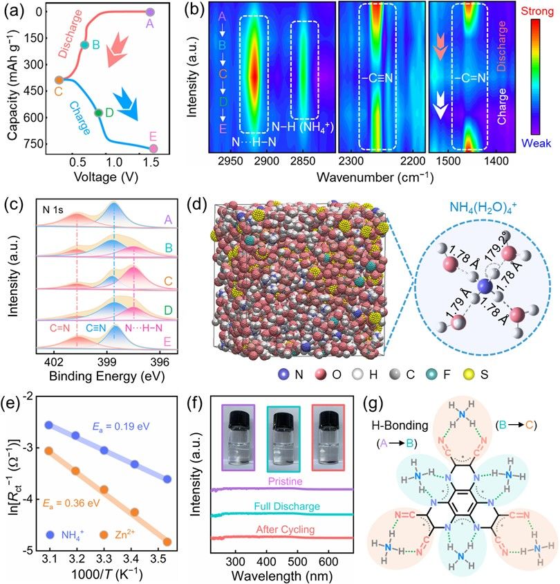 异位光谱和分子动力学模拟研究表明了DQH中亚胺/氰基位点NH4+配位十二重氢键作用,其高度稳定的十二重氢键网络有效抑制活性官能团溶解,充分暴露亚胺/氰基活性中心,克服Zn2+去溶剂化能垒过高引起的动力学迟滞问题,有效降低NH4+扩散迁移/反应势垒,促进了超稳定和快速的NH4+电荷载体存储。