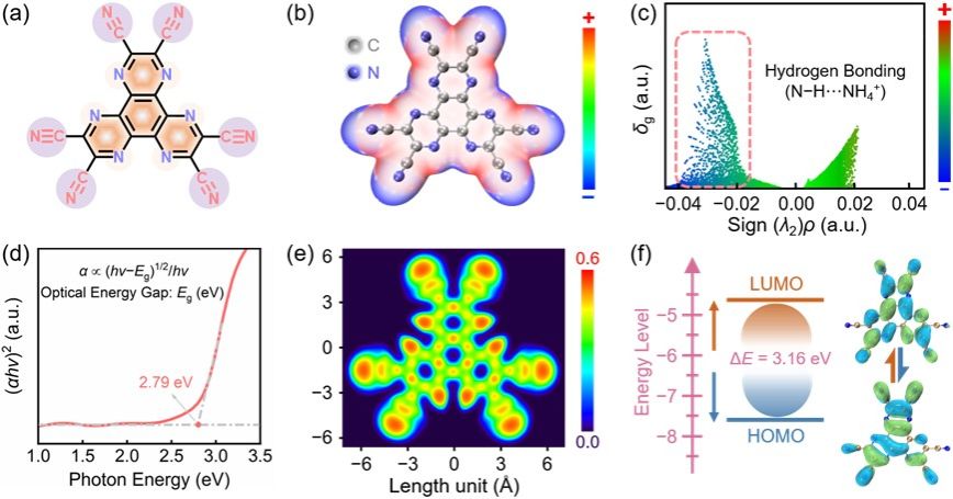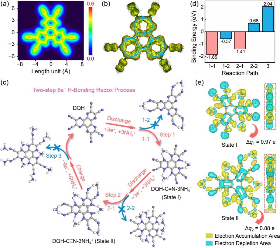 研究人员合成的有机正极材料为二吡嗪[2,3-f:2′,3′-h] 喹喔啉-2,3,6,7,10,11-六腈(DQH)。实验表征和理论计算表明DQH具有氮杂环π-共轭的芳香结构、多电子亚胺/氰基活性位点和较低能带间隙,有助于加快电子转移动力学和电极氧化还原速率,促进高效NH4+耦合电荷存储。