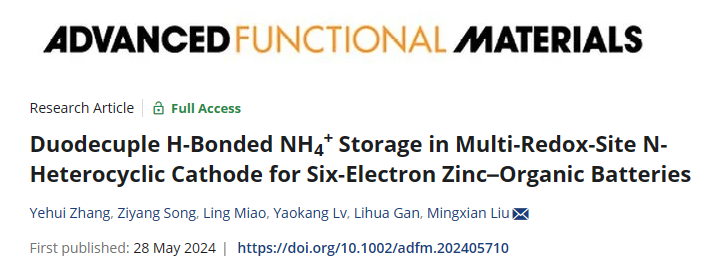 近年来,有机小分子因其高密度氧化还原位点和高理论容量被广泛用作水系锌离子电池的正极材料,但存在电导率低且易溶于电解液问题,引发电池容量快速衰减。此外,有机电极材料的性能也取决于电荷载体的扩散/配位动力学。与传统Zn2+储存相比,非金属NH4+电荷载体具有柔性四面体结构、独特择优取向性、小的离子半径和质量,并且可以通过氢键作用与正极活性基团配位,从而有效提升锌离子电池的循环稳定性。这些优势使得NH4+离子成为构筑先进锌-有机电池理想的电荷载体。然而,如何设计兼具高密度氧化还原位点、高电子导电性和稳定NH4+存储的有机小分子正极材料在水系锌-有机电池研究中颇具挑战。best365中国官方网站刘明贤教授团队长期致力于高效储能材料研究并应用于新能源电池开发,近期该课题组设计了一种具有多活性位点氮杂环有机正极材料,解决了有机小分子易溶解的问题,构建了快速和稳定的水系锌-有机电池,相关研究成果以“Duodecuple H-Bonded NH4+ Storage in Multi-Redox-Site N-Heterocyclic Cathode for Six-Electron Zinc-Organic Batteries”为题发表于国际知名期刊《先进功能材料》(Advanced Functional Materials)。