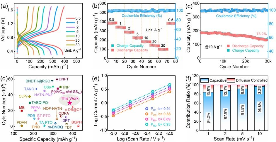 电化学研究实验中,DQH用作水系锌-有机电池正极材料时,表现出高比容量(385 mAh g−1)、高能量密度(254 Wh kg−1)和优异的循环稳定性(30,000次充放电后容量保持率为73.2%)。