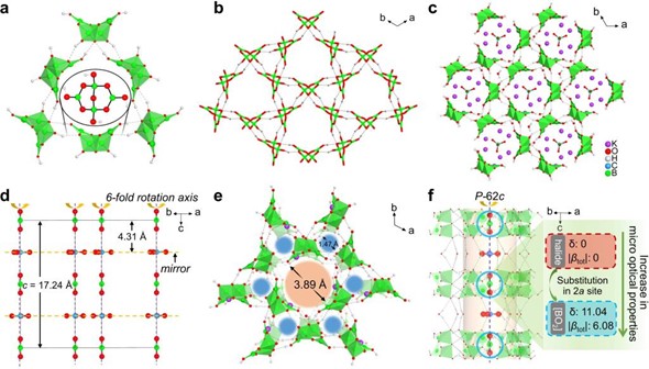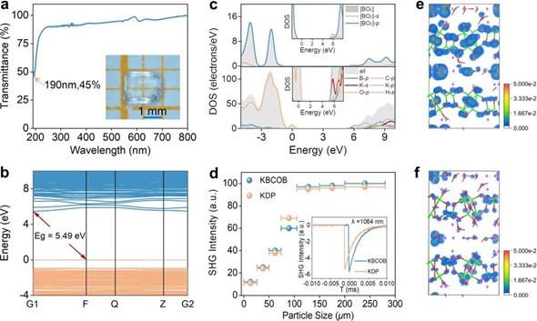在已发现的三千多例硼酸盐晶体材料中,仅有八例晶体材料含有[BO2]基元,并且这些[BO2]基化合物全部都是通过高温固相或溶剂热等制备方法得到的。尤其是,含[BO2]基的深紫外非线性光学晶体至今未见诸报道。在近期的这一研究中,张弛研究团队提出了一种超卤素取代调控能带结构的分子设计方法,运用便捷的溶液挥发法制备了第一例含超卤素[BO2]基元的深紫外非线性光学晶体。单晶X射线衍射分析表明,KBCOB的三维准蜂窝状骨架结构是由聚阴离子簇[B4O5(OH)4]¥、抗衡阳离子K+、[BO2]、[CO3]基元、以及H2O组成。其中,聚阴离子簇[B4O5(OH)4]由两个[BO4]和两个[BO3]通过共享氧原子的方式组成,聚阴离子簇[B4O5(OH)4]再通过氢键作用与四个相邻的聚阴离子簇连接,在ab平面中形成孔道直径为3.89Å和1.47Å的二维B4O5(OH)4]层。二维层沿着c轴以−AAA−序列平行堆叠,层间距为4.53Å。K+、[BO2]、[CO3]基元、以及H2O均位于三维结构孔道中。其中,[BO2]和[CO3]基元在孔道中沿c轴交替排列。在晶体结构分析基础上,研究团队进一步探讨了π共轭基元,特别是线性[BO2]基元对晶体材料结构、光学带隙、倍频效应、以及双折射的影响。从结构角度来看,卤素和超卤素具有相似的电子结构和化学性能,处在晶体结构中特殊位置的卤素可以被超卤素原位取代。与卤素不同的是,超卤素[BO2]基元具有大的超极化率和极化率各向异性,同时保持宽的HOMO-LUMO能隙。因此,引入[BO2]基元有利于优化提升短波紫外非线性光学晶体材料的倍频效应和双折射率。