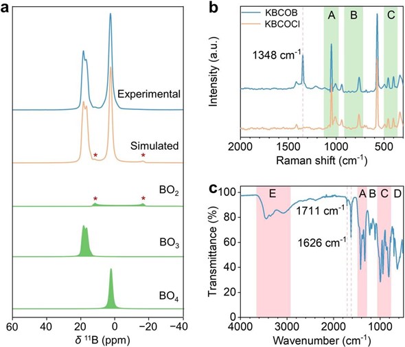 张弛研究团队运用固态核磁、红外、拉曼等多种光谱技术证实了KBCOB结构中三种π共轭阴离子基元([BO2],[BO3], 和[CO3])的共存,他们还采用单晶结构X射线衍射分析结合第一性原理理论方法进行模拟计算,深入探讨并阐明了KBCOB能实现强倍频效应和显著增益的双折射率可归因于[BO2],[B4O5(OH)4]和[CO3]基元的协同作用。态密度计算则揭示了超卤素[BO2]基元使材料价带顶部向下移动,导致深紫外非线性光学性能(包括宽带隙、二次谐波产生和双折射等)的同步优化增强。实验研究显示,KBCOB具有深紫外吸收截止边(< 190 nm)和强的粉末倍频响应(1.0 × KDP @ 1064 nm),其双折射率为母体卤代氧化物KBCOI的15倍。该研究为探索深紫外非线性光学晶体材料提供了一种全新的设计方法。