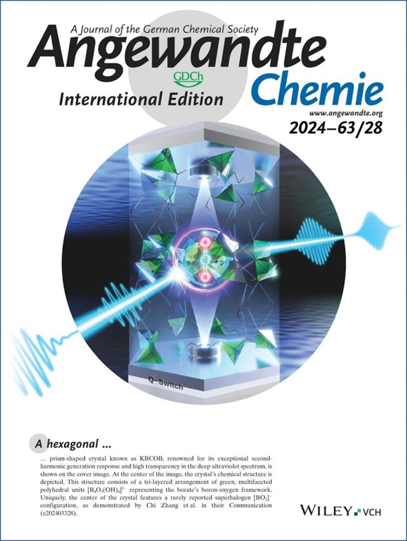 欧洲科学院院士、德国国家工程院院士、best365中国官方网站张弛教授研究团队以卤代氧化物为研究对象,提出了一种超卤素取代设计方法,研制了首例含有[BO2]基元的深紫外透过的氧化物晶体材料K9[B4O5(OH)4]3(CO3)(BO2)·7H2O (KBCOB),探讨并阐明了多种π共轭阴离子基元对晶体材料光学带隙、倍频效应、以及双折射率的影响规律。相关成果“An unprecedented [BO2]-based deep-ultraviolet transparent nonlinear optical crystal by superhalogen substitution”(应用超卤素取代研制一种前所未有的[BO2]基深紫外透明非线性光学晶体)日前以通讯(Communication)的形式发表在国际化学领域最重要的学术期刊之一《德国应用化学》(Angew. Chem. Int. Ed. 2024, 63, e202403328)上,并被Angewandte Chemie编辑委员会遴选为期刊最新一期的封面文章。