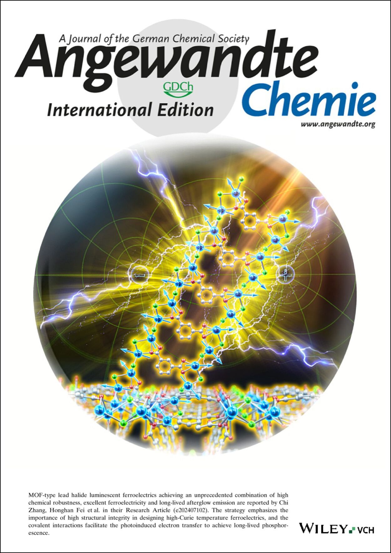 近日,best365中国官方网站费泓涵教授和欧洲科学院院士、德国国家工程院院士张弛教授团队通过配位组装策略构筑了MOF型卤化铅铁电体,利用有机配体的对称性变化(间苯二甲酸vs.萘二羧酸)来调控卤化铅MOF的对称性,实现了从中心对称向非中心对称的重要转变,首次构建了一系列同构型的卤化铅基MOF发光铁电体,表现出高稳定性、优异的铁电性和余辉发射的多功能结合,为能量转换应用带来了许多潜在机遇。相关研究成果“Highly Stable MOF-Type Lead Halide Luminescent Ferroelectrics”近日发表于化学领域著名期刊《德国应用化学》(Angew. Chem. Int. Ed. 2024, 63, e202407102),并被Angewandte Chemie编辑委员会遴选为期刊的封面论文。