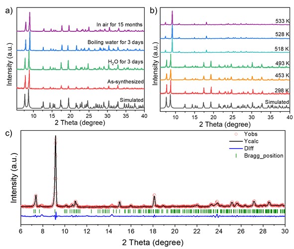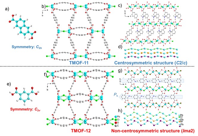 研究人员采用间苯二甲酸构建了一系列同构、非中心对称的卤化铅基MOF [Pb2X][1,3-bdc]2 (X=Cl−/Br−/I−)。晶体结构解析表明这三例卤化铅基MOF均呈现铁电空间群Ima2,其SBU基于易结构畸变的一维[Pb2X]+ (X=Cl−/Br−/I−)链,Pb2+和间苯二甲酸羧发生定向配位,Pb2+离子沿[001]方向发生偏移。与此同时,由2,6-萘二羧酸作为配体构筑的卤化铅基MOF呈现中心对称的C2/c空间群,不具备铁电性。通过稳定性测试,这类MOF材料在大气室温环境条件下具有至少15个月的长期稳定性,在沸水、酸碱性测试等条件下均表现出很强的化学稳定性。