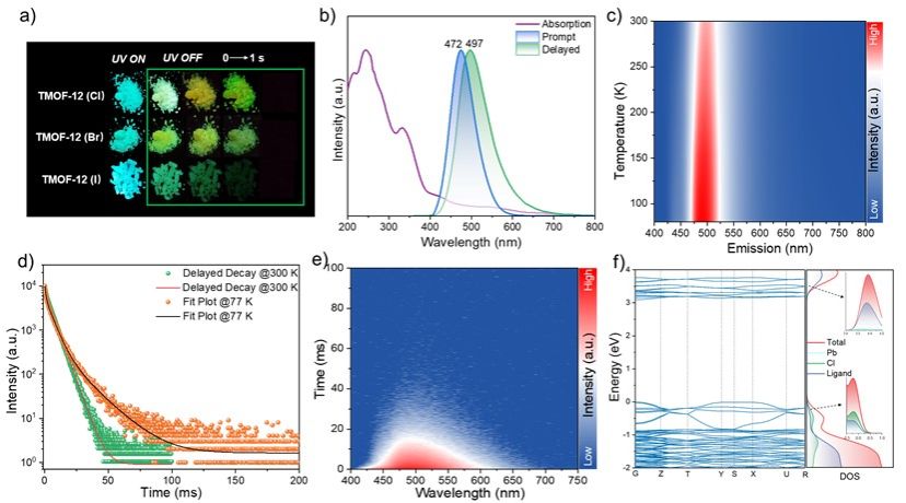 集成铁电性和光致发光特性的多功能材料,在涉及电场-发光性能的操控和多功能信息读取等新型光电子应用中扮演着重要的角色。有机卤化铅材料由于具有高度的化学和结构可调性、优良的加工性能和独特的发光特性,被认为是一类潜在优异的分子型发光铁电体。然而,这类材料由于本征离子键合结构使其在物理和/或化学刺激(如加热、光、氧气和水分)下容易分解,通常导致相对较低的居里温度(Tc),并阻碍了其在实际体系中的应用。金属有机框架材料(MOF)作为一种配位组装的晶态多孔材料,具有优异的化学稳定性,但其高度对称的金属-氧基次级结构单元(SBU)和有序的拓扑结构使绝大多数MOF呈现中心对称的空间群。因此,实现具有高稳定性、铁电性和余辉发射的多功能卤化铅发光铁电体仍是一项重大挑战。