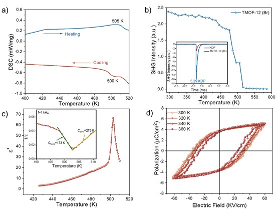 系统的铁电性表征表明,由间苯二甲酸构建的三例卤化铅基MOF均呈现铁电性,其中溴化物的Tc温度高达505 K,饱和极化值达到4.5 μC/cm2,具有较强的SHG信号(达5.29 × KDP),信号强度随温度升高在Tc左右逐渐降至零,明显的介电异常进一步表明铁电到顺电的相变。压电响应力显微镜进一步直接观察到了铁电畴的变化和反转。同时,在理论计算的基础上成功构筑了高温顺电结构,证明相变来源于两个方面:一是铅原子的位移导致无机骨架畸变程度大幅降低,使其以更有序的方式排列以抵消c-轴极性;二是孔道中有机小分子(CH3)2NH2+在高温下发生旋转并产生无序化。此外,卤化铅SBU与间苯二甲酸的配位连接促进了两组份间的电荷转移,其中有机组份(间苯二甲酸)的磷光发射和无机组份(卤化铅)的强可见光吸收协同作用,实现了高效的自旋轨道耦合和系间穿越,产生了室温长寿命的余辉发射(5.155 ms)和高的发光量子产率(90.7%)。