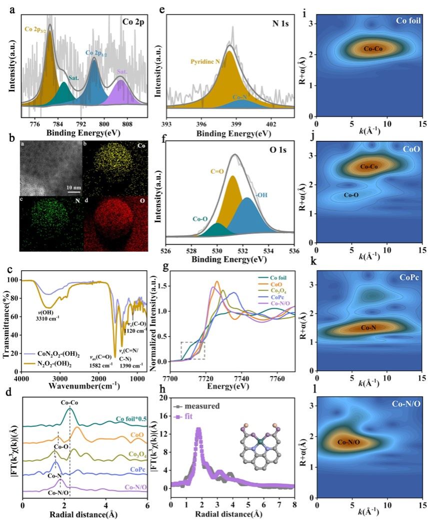根据DFT计算的结果指导催化剂的合成,研究人员合成了目标催化剂羟基辅助的钴单原子(CoN2O2-(OH)2),通过红外光谱和同步辐射进行了证明。利用同步辐射精确确定其配位结构,R空间拟合结果显示Co原子与2个N和2个O配位的结构(图h)。