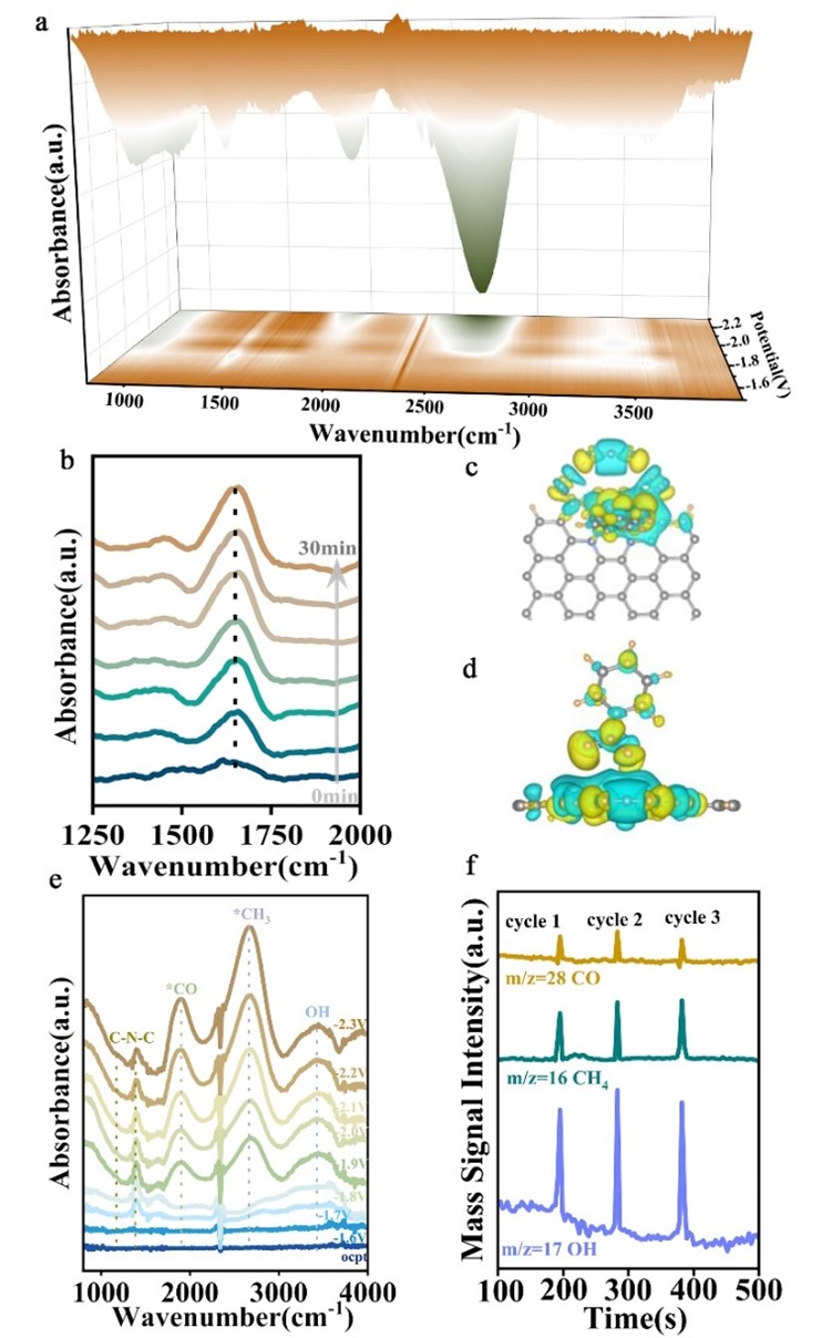 原位红外光谱和原位在线质谱结合清晰地阐明了电催化硝基苯和CO2氮双耦联碳成键合成N,N-二甲基苯胺反应机理。通过原位红外光谱检测到在波长1172、1380,1895,2660和3428 cm-1处对应的C-N-C键、*CO、*CH3和OH中间体,表明这些中间体可能是合成N,N-二甲基苯胺的关键中间体,并通过原位在线质谱进行了佐证。基于CO2和硝基苯还原中的物种检测,推测反应路径为PhNO2+ CO2→ *PhNOOH + *CO → *PhNO + *CO → *PhNOCO → *PhNOCH3+ *CO2→ *PhNOHCH3+*CO → *PhNCH3+ *CO → *PhNCOCH3→ PhN(CH3)2。这与DFT计算推测的路径一致。