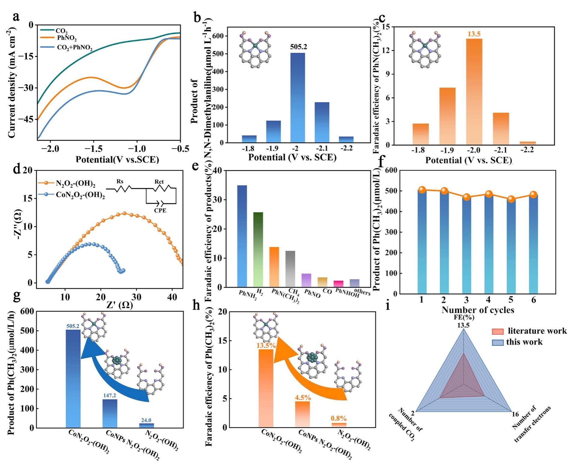研究团队对电催化CO2和硝基苯氮双耦联碳成键合成N,N-二甲基苯胺的性能进行了测试,结果表明氮氧配位的钴单原子催化剂CoN2O2-(OH)2实现了高效氮双耦联碳成键合成N,N-二甲基苯胺,在-2V时N,N-二甲基苯胺的产率达505.2 μmol L⁻¹ h⁻¹,并且具有高的电化学稳定性。