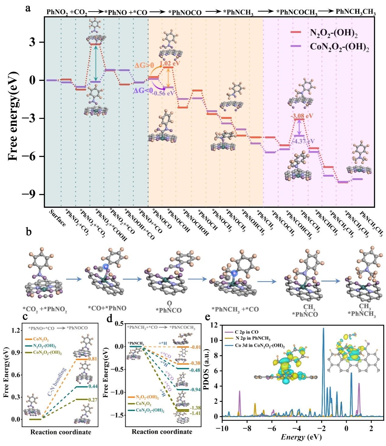 研究团队通过DFT计算预测CO2和硝基苯进行氮双耦联碳成键合成N,N-二甲基苯胺的可行性。DFT计算的结果表明,羟基辅助的钴单原子(CoN2O2-(OH)2)能够实现C-N-C成键,其原因是催化还原CO2和硝基苯C-N成键后的*PhNCH3中间体能够继续与CO2的还原中间体*CO耦联实现C-N-C成键,产生合成N,N-二甲基苯胺的关键中间体*PhNCOCH3自由能低,反应更容易发生。
