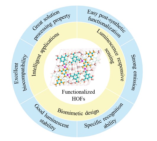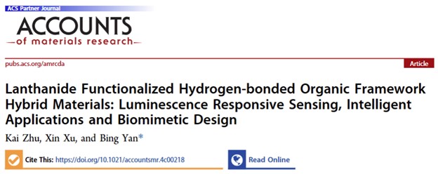 氢键有机框架(Hydrogen-bonded organic frameworks, HOFs)作为一种新兴的晶态多孔材料,主要由纯有机或金属有机构建单元通过氢键相互作用构筑而成,框架可通过范德华力、静电、π-π、 C-H…π相互作用等进一步强化。功能化氢键有机框架是指通过离子交换、配位后合成修饰和原位合成等策略将外来功能物种引入HOFs框架以赋予其特定功能的杂化材料。发光功能化HOFs可以产生丰富的发光中心,能对特定的分析物或刺激表现出敏感的光响应变化(开、关或比率变化)。这些特性使功能化HOFs材料和器件能够实现对各种化学刺激甚至物理刺激的传感。best365中国官方网站闫冰教授团队自2021年开辟了基于功能化HOFs特别是镧系功能化HOFs杂化材料在光功能应用、光响应传感、智能检测与仿生模拟方面的系统工作,相关结果先后在Adv. Mater、Adv. Funt. Mater.、Adv. Opt. Mater.、Adv. Health. Mater.、Mater. Horiz.、J. Mater. Chem. A、Inorg. Chem. Front.、Anal. Chem.、ACS Sensors、ACS Appl. Mater. Interface、Inorg. Chem.等国际重要期刊发表研究论文二十多篇。基于前期系统性工作,该团队近期在国际知名期刊Accounts of Materials Research上发表题为“Lanthanide Functionalized Hydrogen-bonded Organic Framework Hybrid Materials: Luminescence Responsive Sensing, Intelligent Applications and Biomimetic Design”的综述性文章。