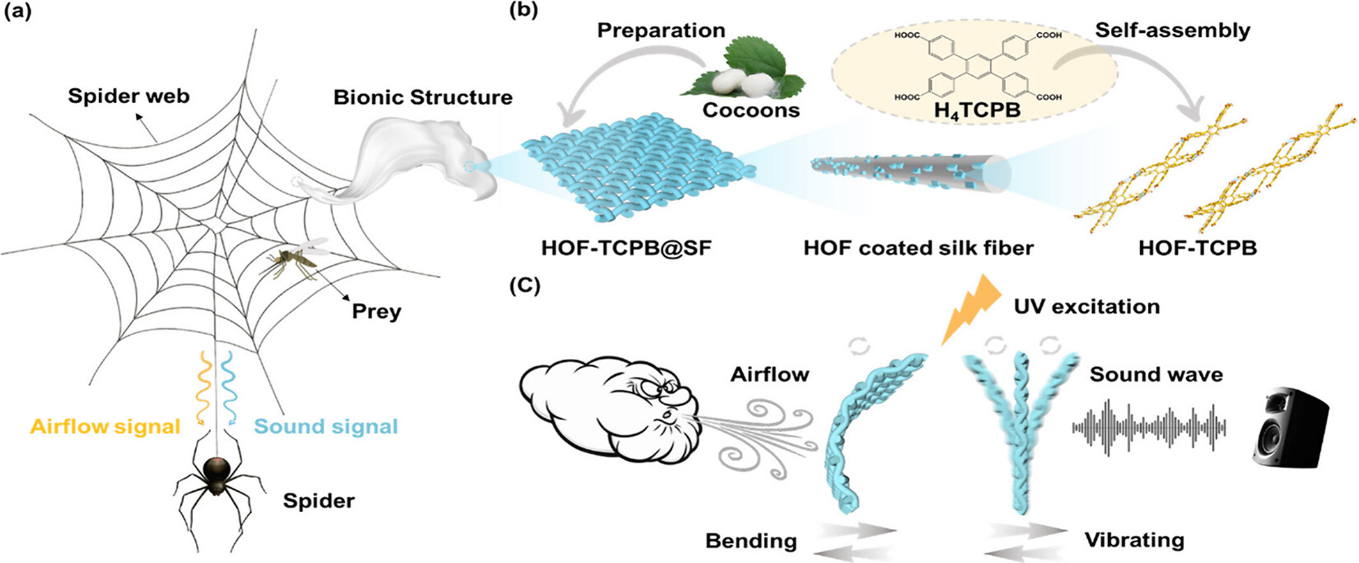 (a)蜘蛛通过蜘蛛网感知气流和声音信号捕食猎物的过程,(b)蜘蛛网仿生结构和HOF-TCPB@SF微观组成示意图(c)基于弯曲和振动响应的HOF-TCPB@SF气流-声学双峰传感器用于气流和声音传感的示意图