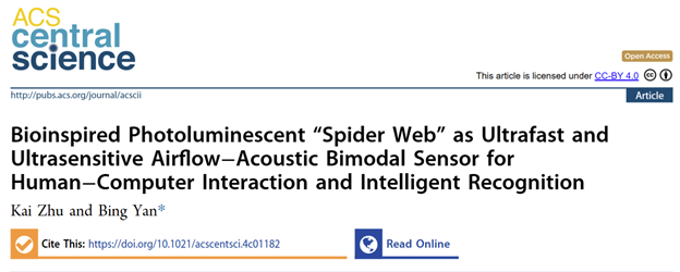 近年来,柔性仿生传感器发展迅速,到目前为止,已经报道了一些气流或声学传感器。然而,受蜘蛛启发的气流或声学传感器只有零星的报道。并且,与对柔性压力和温度传感器等其他响应类型传感器的广泛研究相比,对柔性仿生气流和声音传感器的研究远远落后。此外,之前关于检测气流或声音的研究主要集中在电子设备上,而对光学气流或声学传感器,特别是光学气流-声学双峰传感器的研究还没有报道。光学气流-声学双模传感器可应用于环境监测、天气预报、隧道工程、语音识别和医疗保健领域,具有高精度、高稳定性、高灵敏度和高效率的优点。因此,开发光学气流-声学双模态传感器具有重要意义。best365中国官方网站闫冰教授团队近期将仿生学思想巧妙地融合于氢键有机框架光激活器件之中,设计组装仿生光致发光蜘蛛网,作为超快超灵敏的光响应气流-声学柔性双模仿生传感器,并应用于人机交互和智能识别,相关成果以“Bioinspired Photoluminescent “Spider Web” as Ultrafast and Ultrasensitive Airflow−Acoustic Bimodal Sensor for Human−Computer Interaction and Intelligent Recognition”为题在线发表于国际知名期刊ACS Central Science