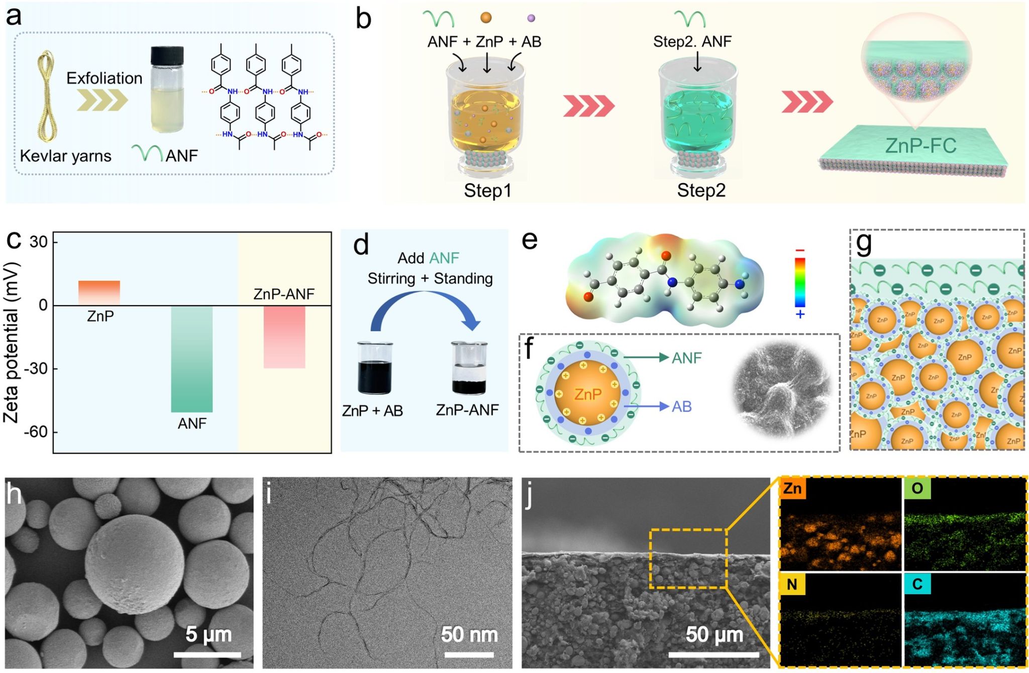 锌电池凭借高安全性、低成本和环境友好性,在可持续储能领域备受关注。相比常规锌箔电极,锌粉(ZnP)电极具备结构设计多样性、形态可加工性和规模化生产潜力等显著优势,但其固有的单分散结构导致了迟缓的离子/电子扩散动力学,限制了其应用。受生物体皮肤和毛细血管结构启发,best365中国官方网站刘明贤教授团队开发了一种仿生类皮肤-毛细管结构的全链离子/电子传导网络的ZnP电极(ZnP-FC),其表面芳纶纳米纤维涂层(皮肤)可有效均一化Zn2+通量,避免H2O-ZnP直接接触,内部芳纶纳米纤维-ZnP交织网络(毛细血管)提升了Zn2+的电镀/剥离效率,增强了电极/电解液界面的稳定性。该研究成果以“Biomimetic Quasi-Skin-Capillary Structure Engineering of Ionic-Electronic Conducting Full-Chain Networks for Stable Zinc Powder Anodes”为题,发表于国际知名期刊《先进功能材料》(Advanced Functional Materials)。