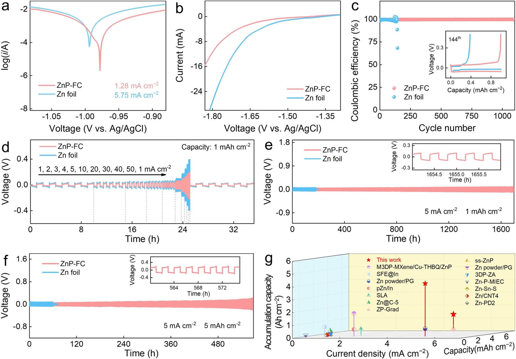 ZnP-FC负极和钒基氧化物正极耦合的全电池表现出高效的离子/电子转移动力学和超长的循环寿命。这项研究工作为仿生锌粉阳极的结构设计提供了新的视角。