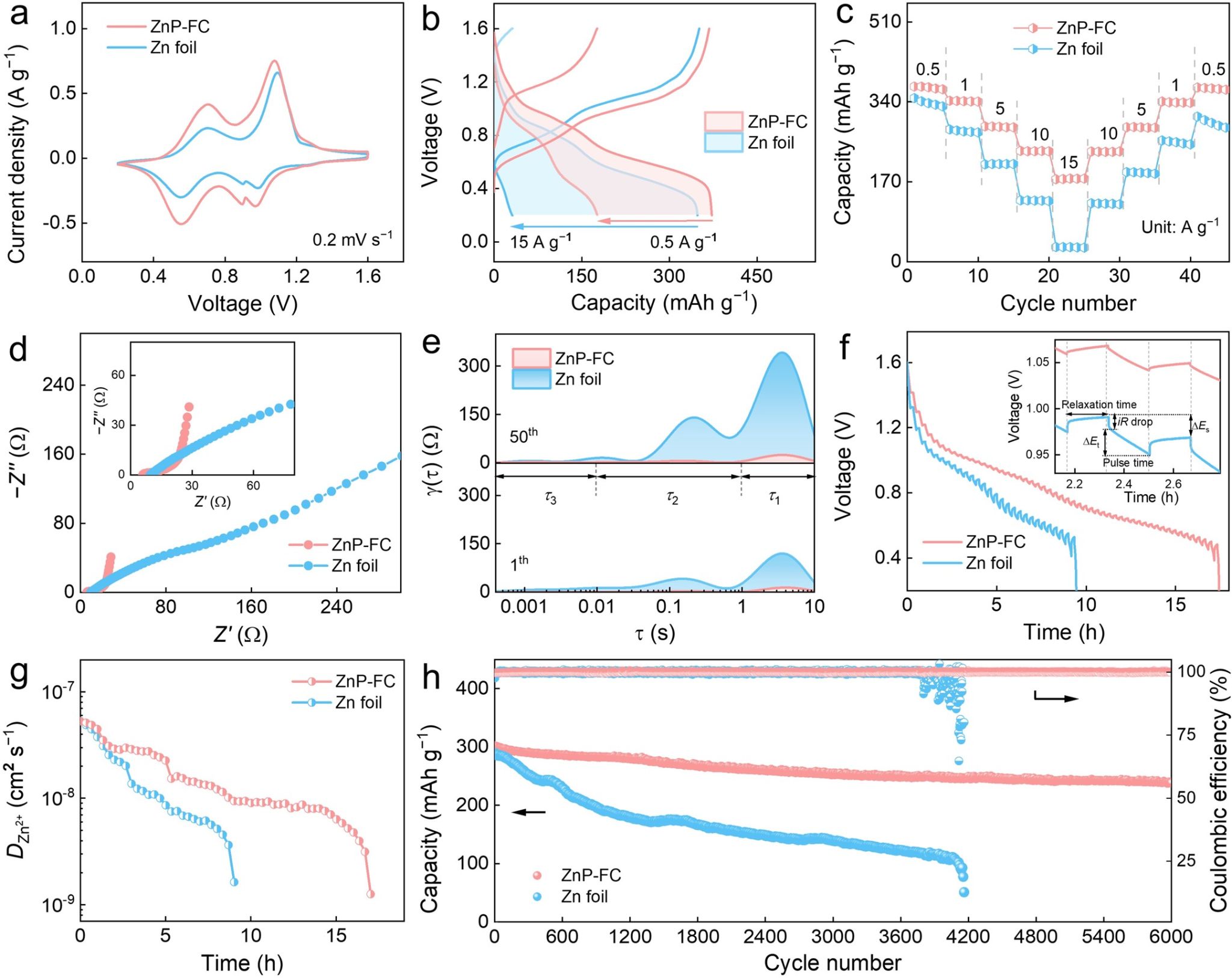 电化学研究结果表明,ZnP-FC电极稳定了电极/电解液界面以提升Zn2+扩散动力学,在半电池和对称电池中都展现出优异的电镀/剥离效率和循环稳定性。