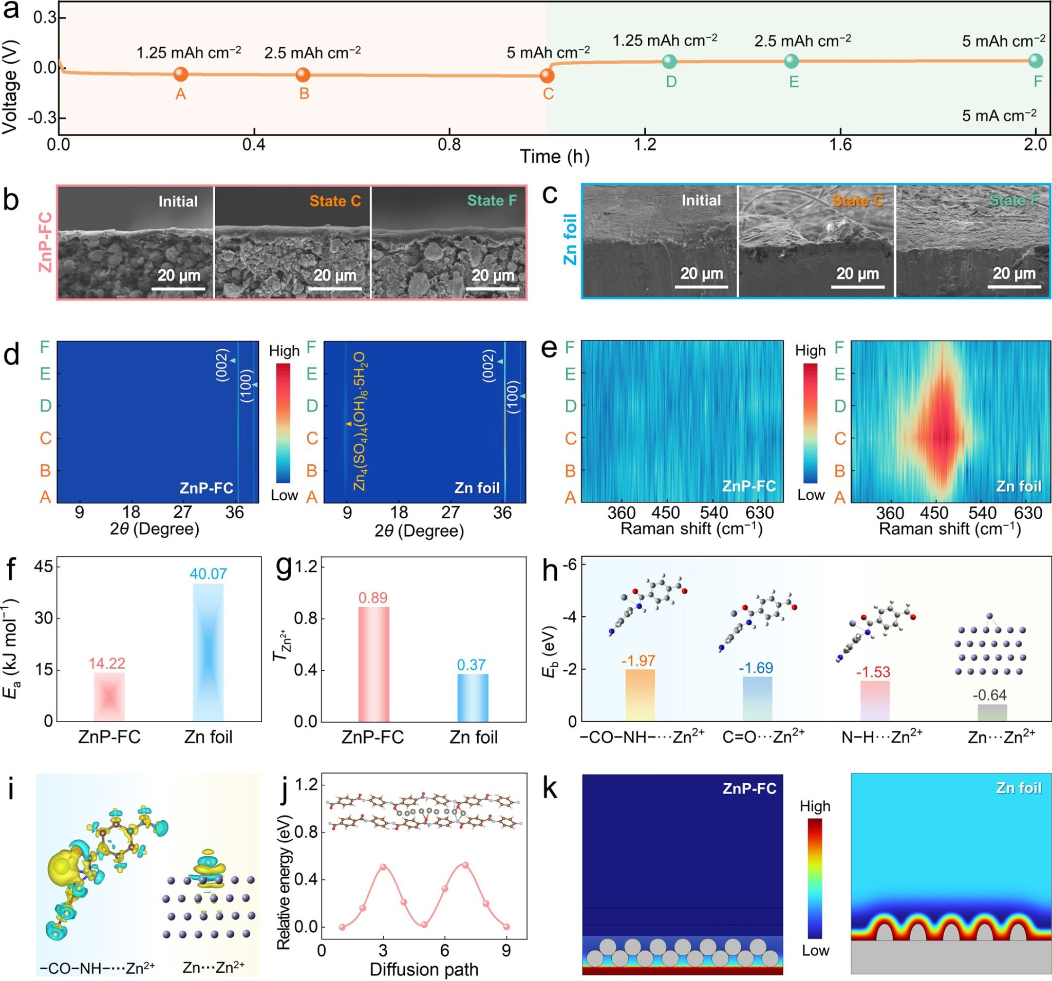 异位光谱实验和理论计算研究表明,ZnP-FC电极有效抑制了锌枝晶和副反应,促进了Zn2+的去溶剂化和传导,实现了高度可逆的电化学反应过程。