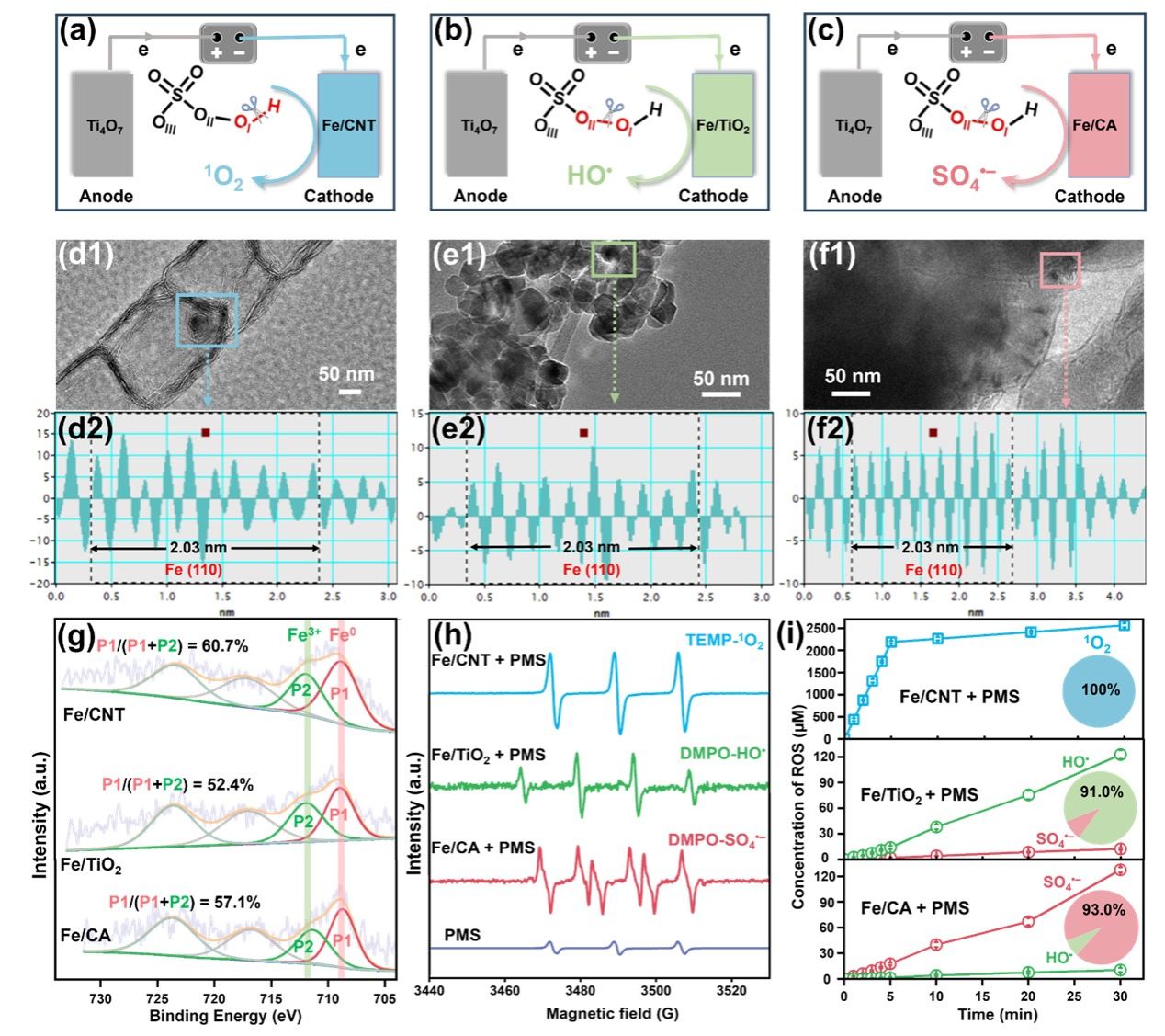 研究团队以碳纳米管(CNT)、商用二氧化钛(TiO2)和碳气凝胶(CA)作为载体分别引入Fe物种,通过电化学平台(保持相同电流和氧化剂用量)活化过硫酸盐(PMS)选择性生成三种经典的ROS1O2, HOSO4•–),为后续的TRS构建提供保障。