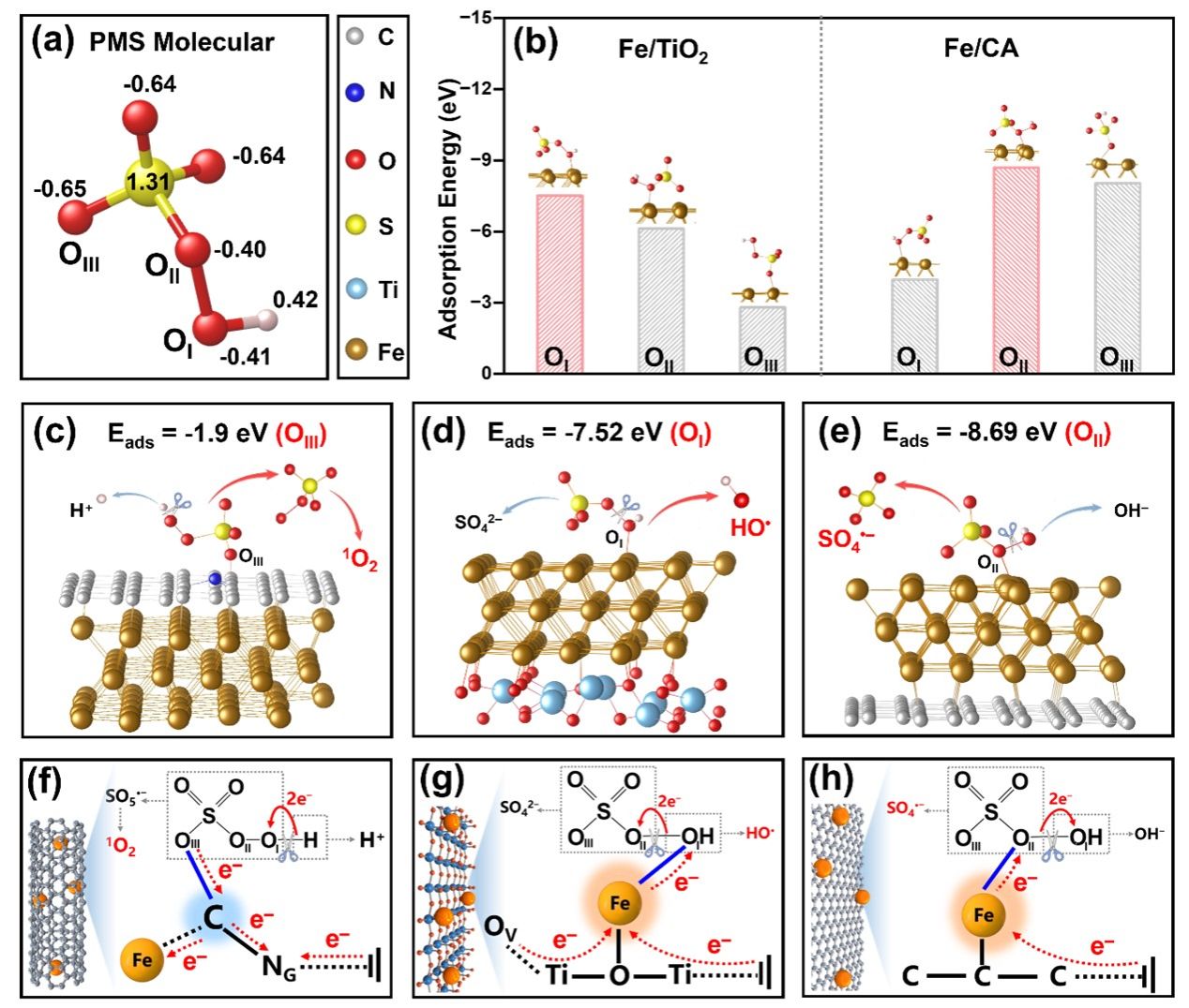 DFT理论计算表明,ROS的选择性生成与阴极活性位点的电子结构有关,它决定了PMSOIII-S=(O)2-OII-OI-H)中O原子的吸附构型及电子转移方向。当OIII原子吸附并转移电子给Fe/CNT电极上的C位点,选择性生成1O2,此外,当OIOII原子分别吸附在Fe/TiO2Fe/CAFe位点时,则促使OII-OI键断裂产生HOSO4•–