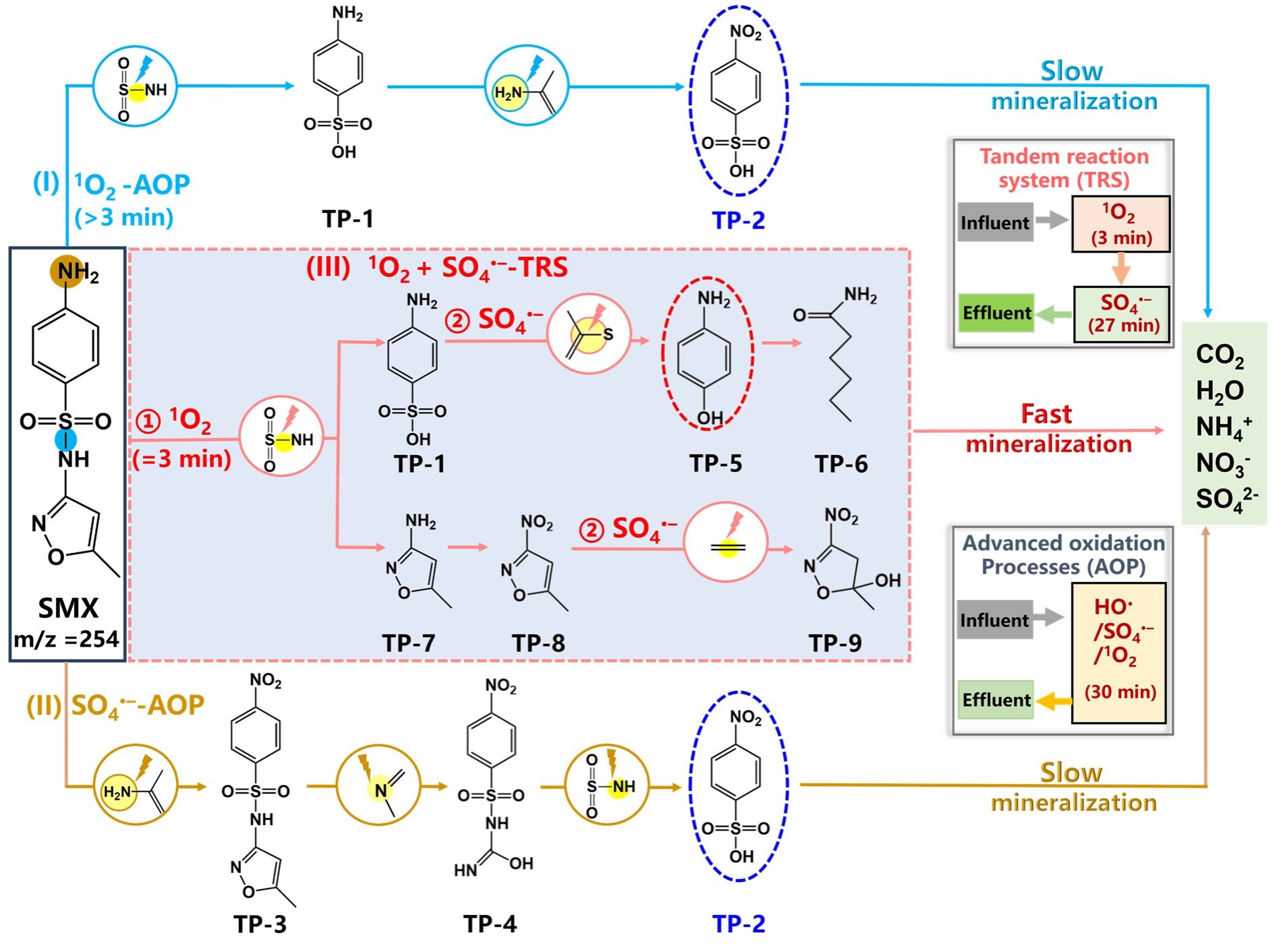 结合理论与实验,探究SMX1O2+SO4•–-TRS体系的矿化机制:1O2选择性地破坏SMX的磺胺桥(S-N键),生成了对氨基苯磺酸中间体。该中间体极易受到后续SO4•–的攻击,有利于SMX的矿化。TRS体系能够充分利用ROS的反应特性,有效避免难降解中间产物的积累,实现污染物的快速且深度矿化。
