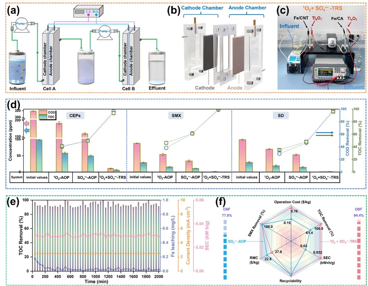 SMX、磺胺嘧啶(SD)和头孢菌素(CEPs)为主要有机成分的实际抗生素制药废水为处理对象,进一步评估1O2+SO4•–-TRS体系的实际应用潜力。1O2+SO4•–-TRS体系在实际废水处理过程中表现出优异的矿化性能,高稳定性和可持续性,说明其作为一种新型的水处理模式具有较大的应用潜力。